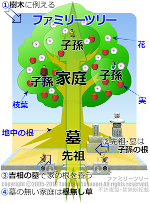 ご先祖様は、この目で直接見ることは出来ないが、私たちの元となる方です。そこで地中にあって目に見えない樹木の「根」に例えます。 先祖・墓は子孫の根であり、その子孫は枝葉です。「根の如く枝葉なる」先祖・墓の如く子孫に、家庭に影響が現れます。